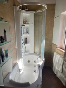 This double room's standout features are the hot tub and fireplace. The double room includes a private bathroom, well-fitted with a bath, a shower, a bidet, a hairdryer and slippers. Guests can make meals in the kitchen that features a stovetop, a refrigerator, a dishwasher and kitchenware. Among the room amenities are a private entrance, soundproof walls and a minibar as well as garden views. The unit has 1 bed.