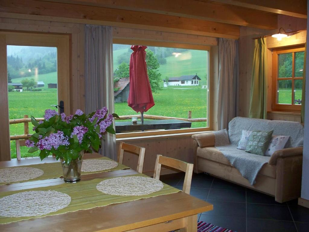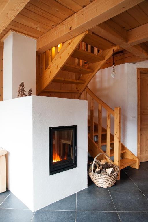 Features a wide glass door with views of the Alps, a TV with satellite channels and a kitchen with dining area. It has a raised sleeping area and a wood-burning stove.