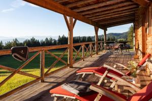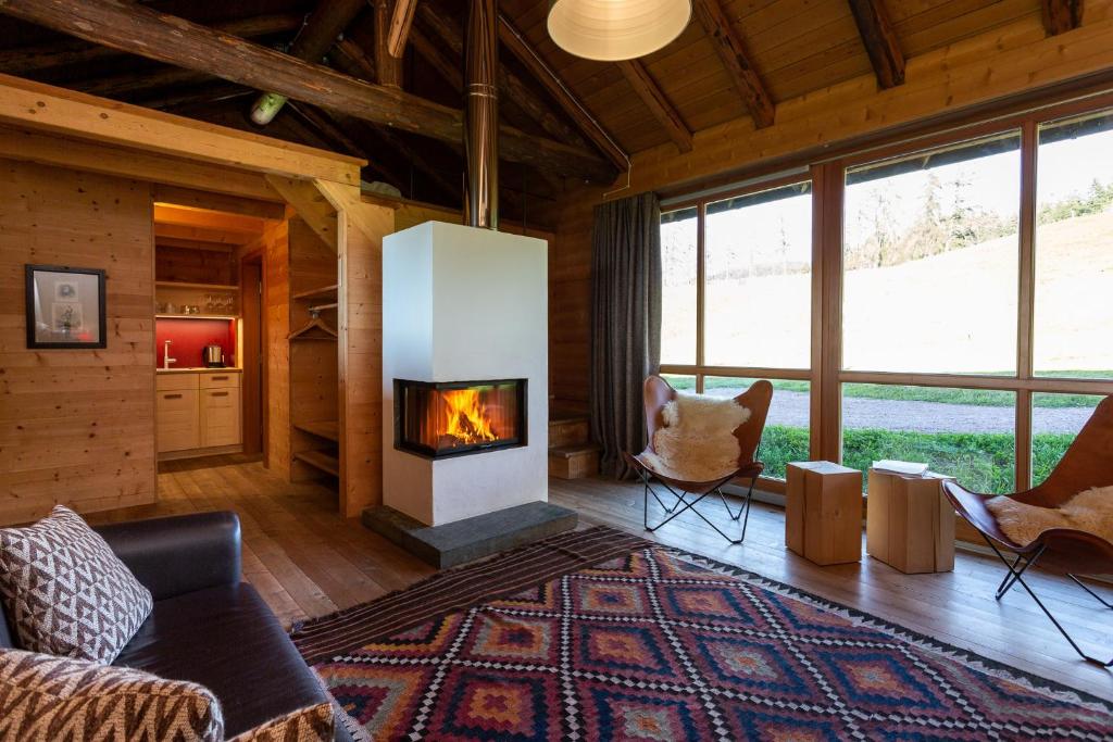 This holiday home in Alpine style comes with a spacious terrace with panoramic mountain views, a living room with a fireplace and a private bathroom with a shower.