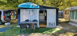 This mobile home features a dining area, kitchenware and stovetop. Guests will use the communal bathrooms of the camping.