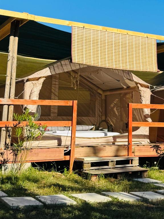 The tent includes a shared bathroom fitted with a shower, a bidet and a hairdryer. The unit has a seating area, garden views, a patio and wine/champagne is available for guests. The unit has 1 bed.