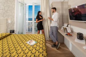 The quadruple room features air conditioning, soundproof walls, a balcony with sea views as well as a private bathroom boasting a shower.