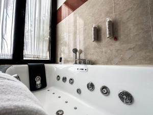 This suite features a living room with sofa, and a private bathroom with a circular spa bath.