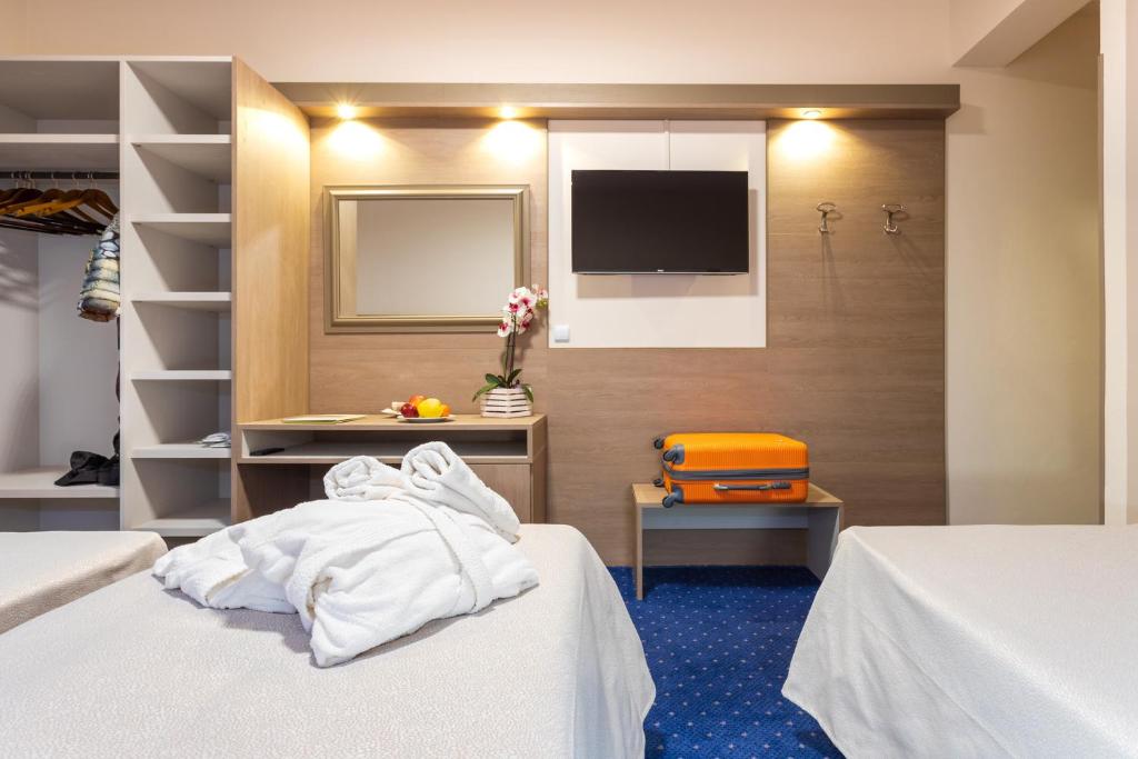 All guest rooms at the hotel are equipped with a flat-screen TV with cable channels and a safety deposit box. The private bathroom is equipped with a bidet, free toiletries and a hairdryer. The rooms feature a desk.