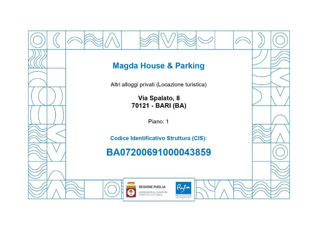 It is possible to check the regularity of the CIN of the accommodation on the website of the Ministry of Tourism: CIN SearchPlaces near Magda House & Parking, Bari