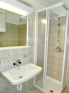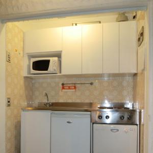 Apartment simply furnished with a balcony, a kitchenette and a bathroom with a shower.