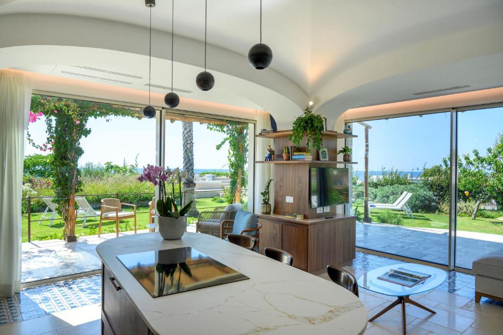 The pool with a view and hot tub are the standout features of this villa. Featuring a private entrance, this air-conditioned villa consists of 1 living room, 2 separate bedrooms and 2 bathrooms with a walk-in shower and a bidet. Guests will find a stovetop, a refrigerator, a dishwasher and kitchenware in the well-fitted kitchen. The villa also offers a barbecue. Boasting a terrace with sea views, this villa also provides a washing machine and a flat-screen TV with streaming services. The unit offers 3 beds.