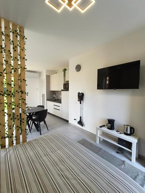 Boasting a private entrance, this air-conditioned apartment features 1 living room, 1 separate bedroom and 1 bathroom with a shower and a bidet. In the well-fitted kitchen, guests will find a stovetop, a refrigerator, a dishwasher and kitchenware. Featuring a terrace with garden views, this apartment also features a washing machine and a flat-screen TV with cable channels. The unit has 2 beds.