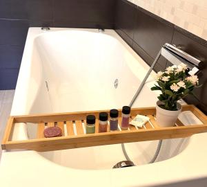 This apartment's special feature is the hot tub. Featuring a private entrance, this air-conditioned apartment consists of 1 living room, 1 separate bedroom and 2 bathrooms with a bath and a shower. In the well-fitted kitchen, guests will find a stovetop, a refrigerator, a dishwasher and kitchenware. The spacious apartment provides a washing machine, a tea and coffee maker, a seating area as well as a terrace with garden views. The unit offers 2 beds.