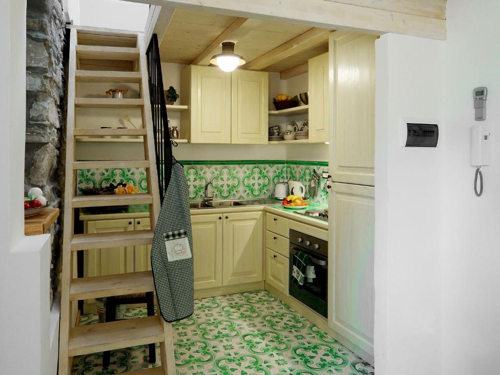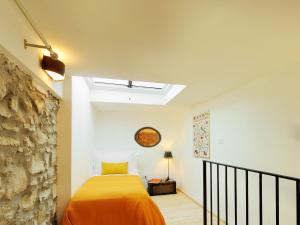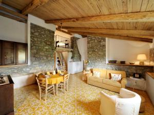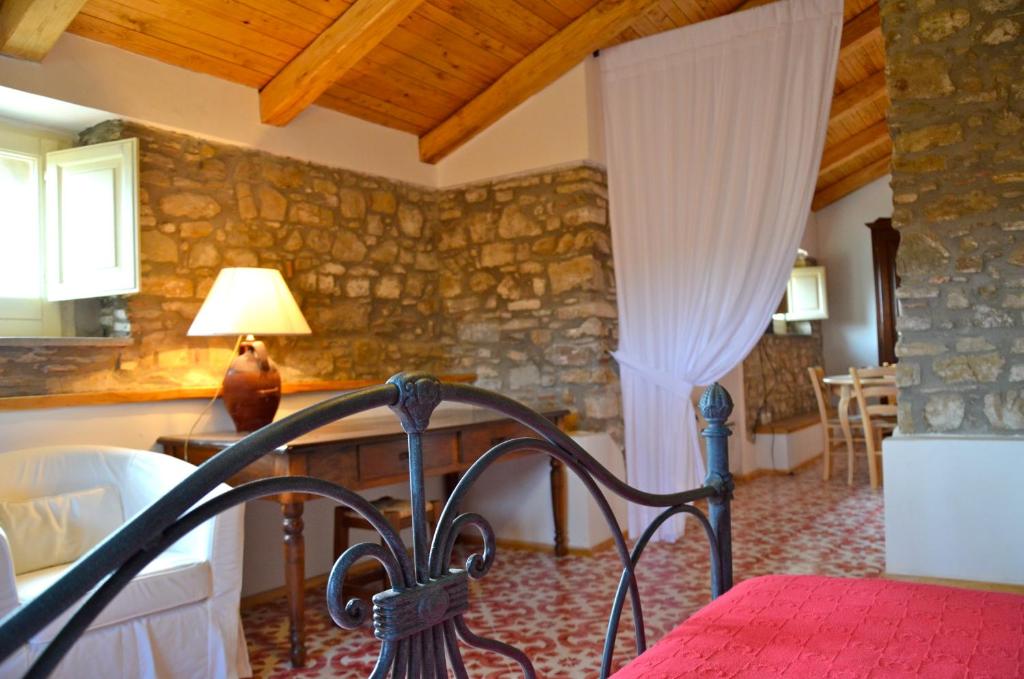 This elegant one-bedroom apartment with wood-beamed ceilings and a wrought iron bed includes a kitchenette, stone walls, and a raised sleeping area.