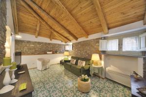 Spacious and elegant studio with wood-beamed ceilings, a raised sleeping area with a single bed, and a double bed on the ground level. The spacious living area includes a kitchenette and a sofa bed.