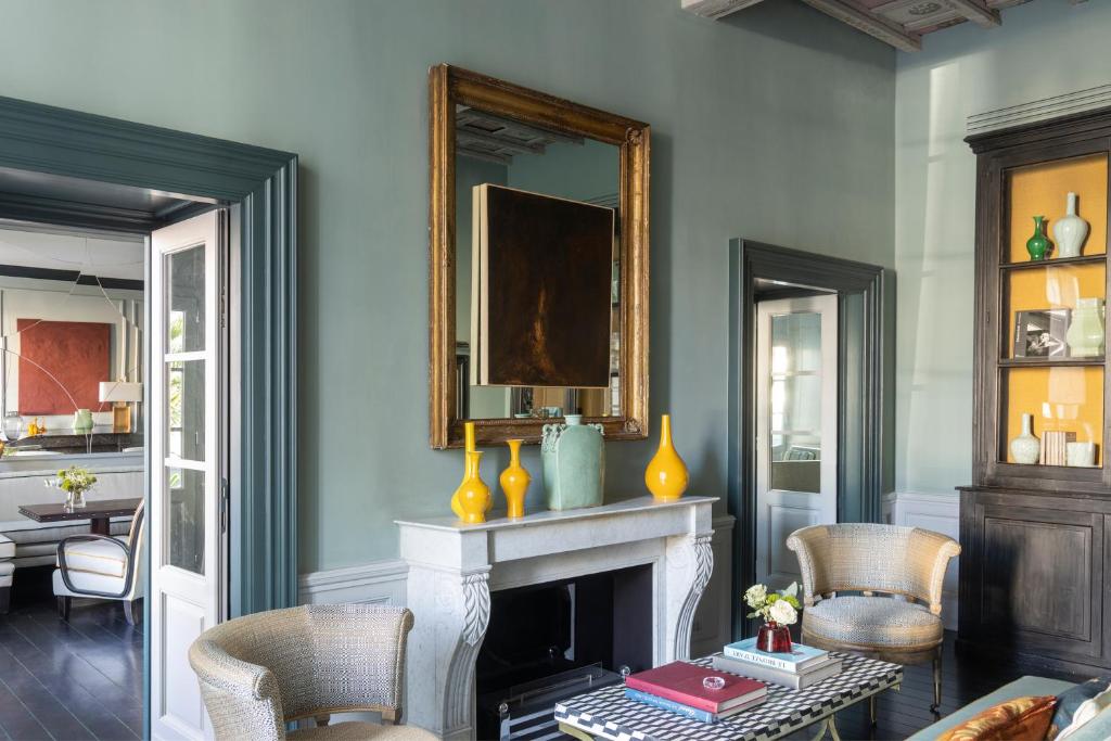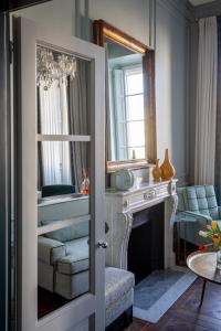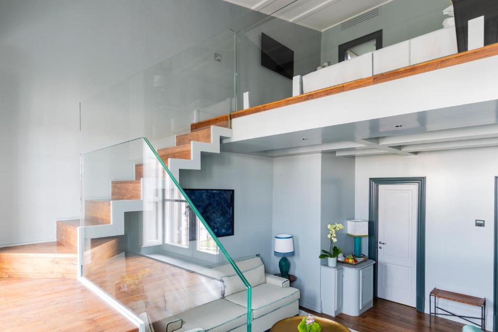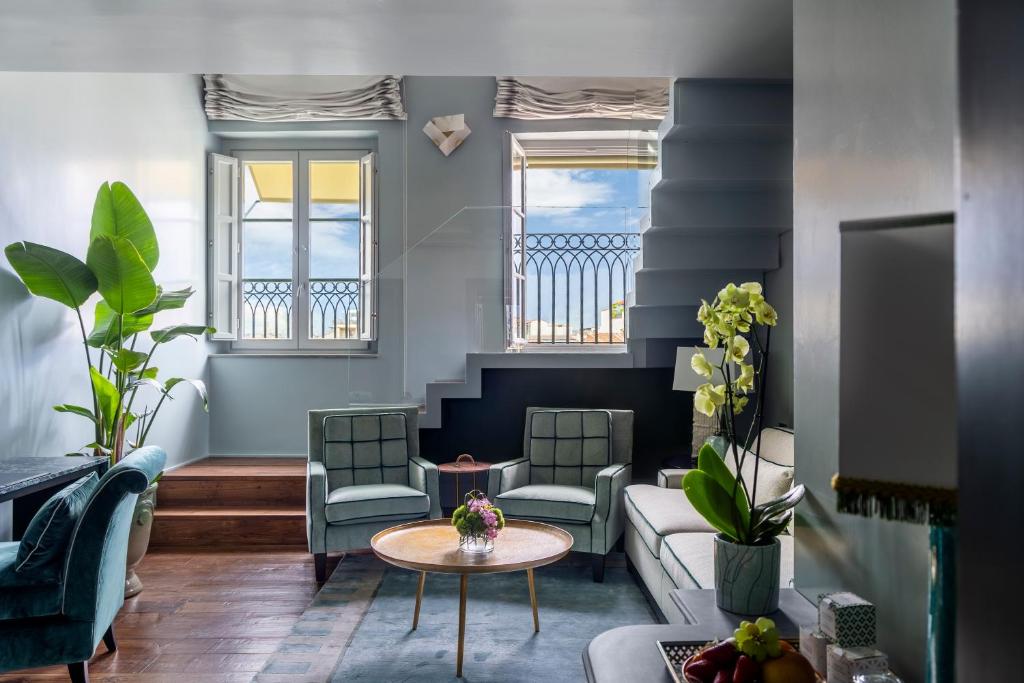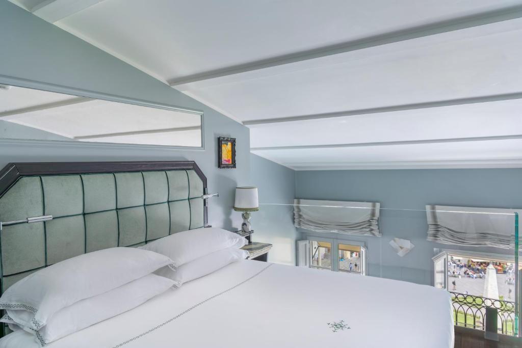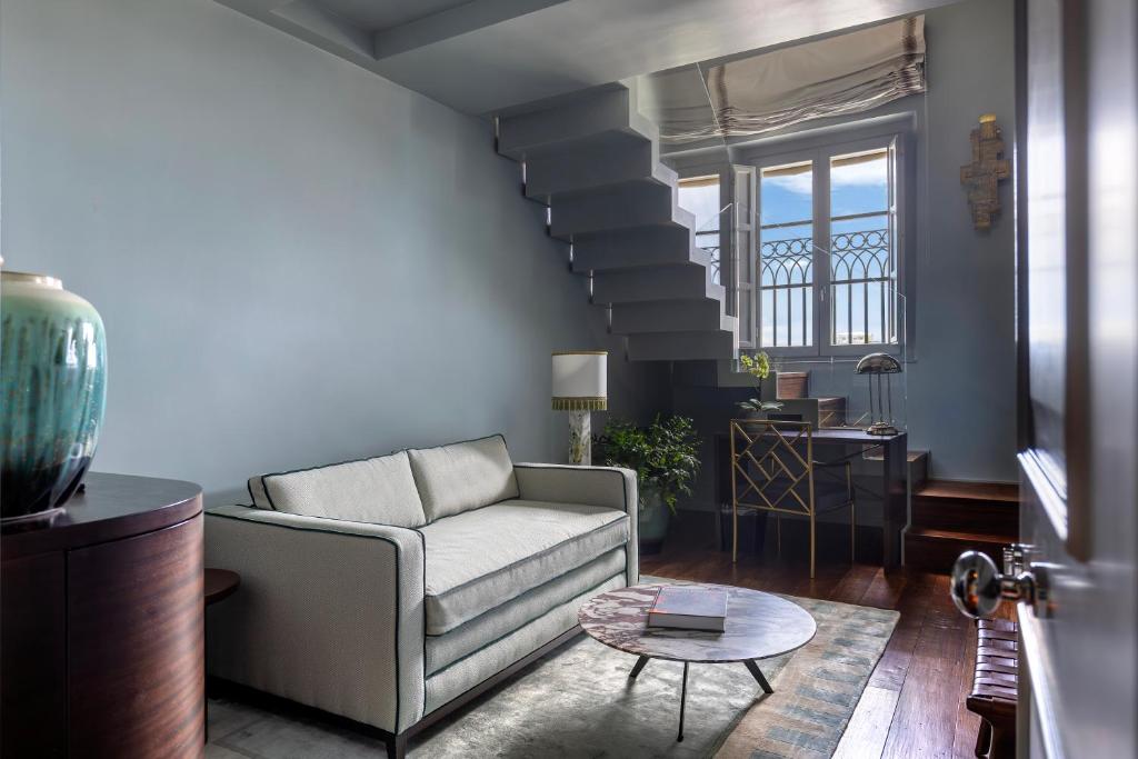 Spacious and elegant suite offering views of Santa Maria Novella square. It includes a decorative fireplace and a living area with a large white sofa.