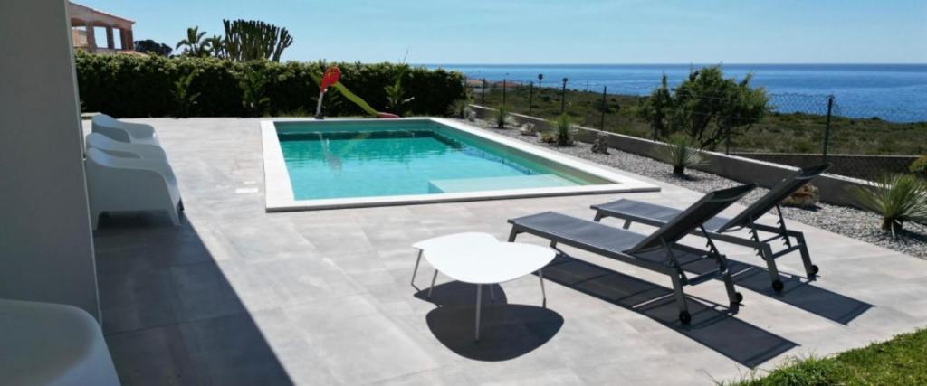 This villa features a pool with a view. The well-fitted kitchen features a stovetop, a refrigerator, a dishwasher and kitchenware. The air-conditioned villa provides a flat-screen TV, a washing machine, a private entrance, a coffee machine as well as sea views. The unit offers 2 beds.