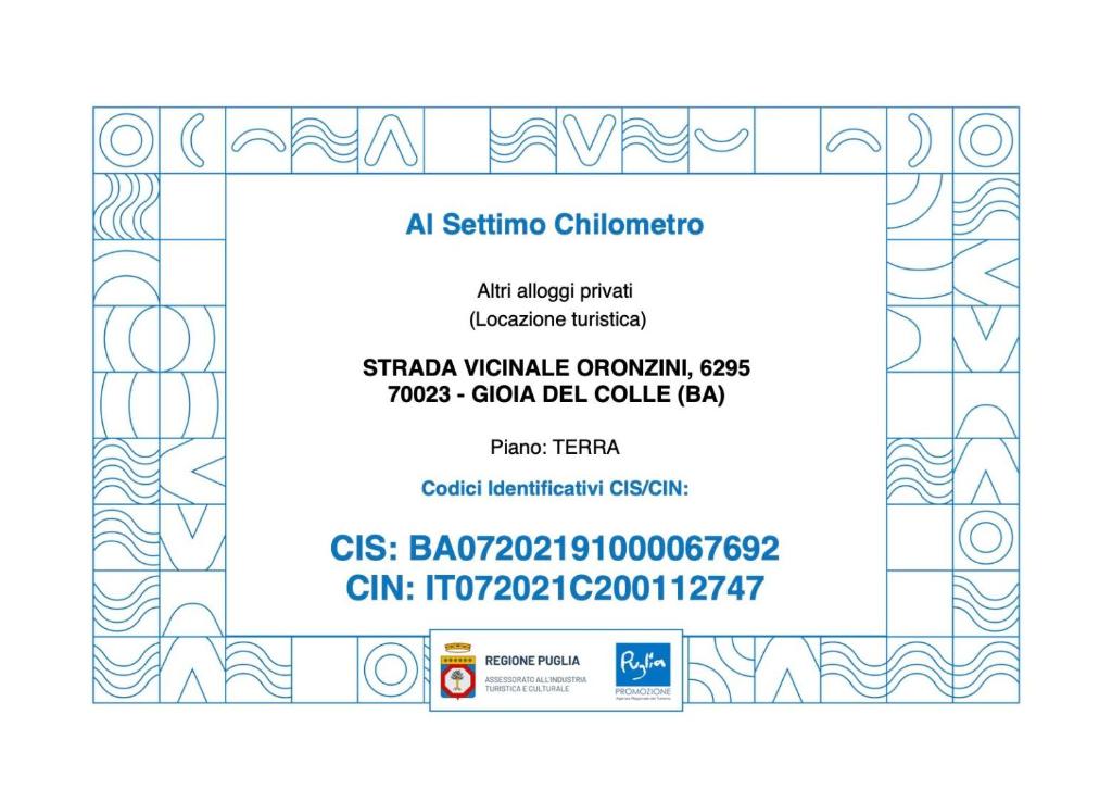Es posible comprobar la regularidad del CIN del alojamiento en la página web del Ministerio de Turismo: Búsqueda CINLugares cerca de Al Settimo Chilometro, Gioia Del Colle