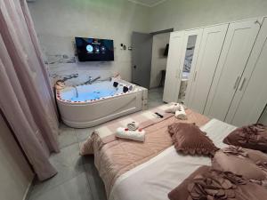 Guests will have a special experience as this holiday home offers a hot tub. Featuring a private entrance, this air-conditioned holiday home is comprised of 1 living room, 2 separate bedrooms and 1 bathroom with a shower and a hairdryer. Guests can make meals in the kitchen that is fitted with a stovetop, a refrigerator, kitchenware and an oven. This holiday home features a washing machine, soundproof walls, flat-screen TV with streaming services, as well as wine/champagne for guests. The unit offers 2 beds.