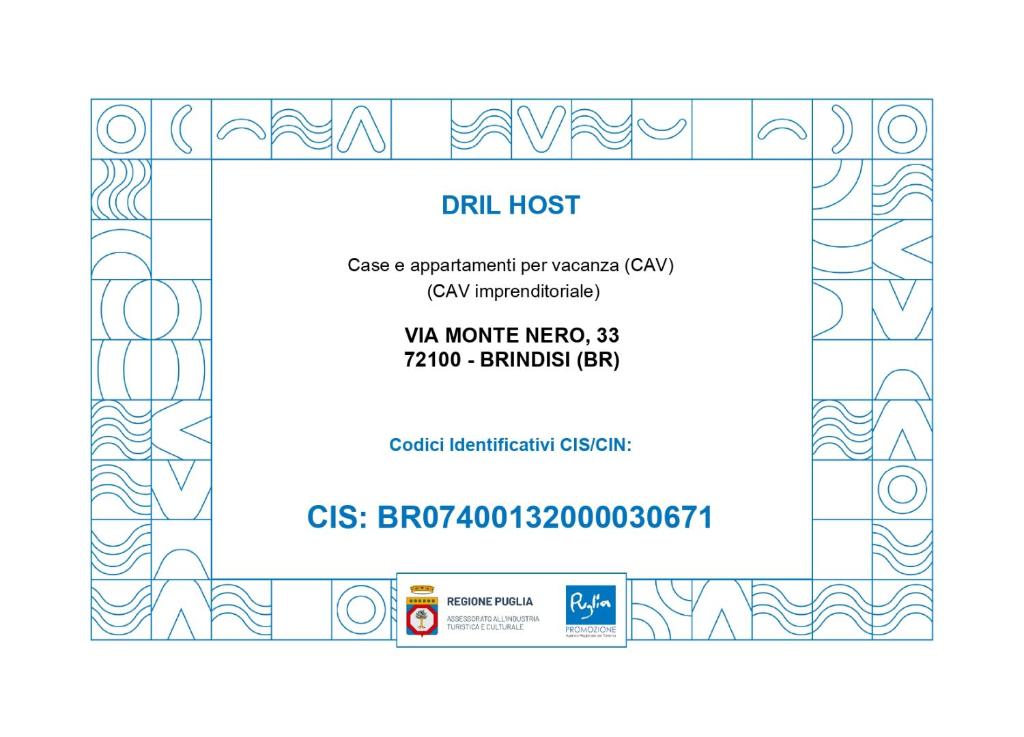 Es posible comprobar la regularidad del CIN del alojamiento en la página web del Ministerio de Turismo: Búsqueda CINLugares cerca de DRIL Host 2, Brindisi