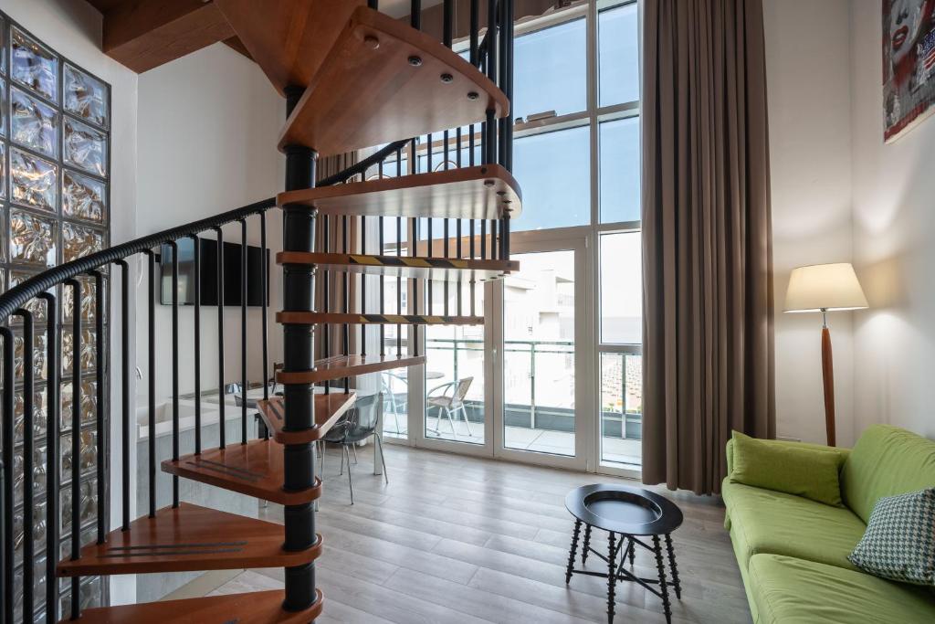 The bedroom is on the mezzanine. The bathroom is complete with Teuco hydromassage shower, soft bathrobes and slippers, and luxurious toiletries.