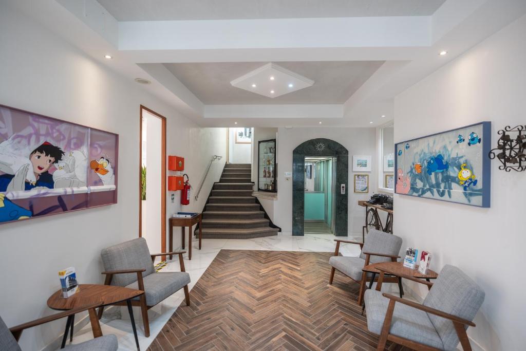 Se encuentra junto a la zona peatonal de Viale Santa Margherita, la calle más importante de Ponente, con sus diversas tiendas. Frente al hotel se encuentra la piscina con hidromasaje, la playa privada, equipada con cabinas, duchas, tumbonas y sombrillas reservadas para los huéspedes y el sugerente paseo marítimo "Scogliera Viva" que llega a la iglesia de la Madonna dell'Angelo, junto a la antigua catedral romana.