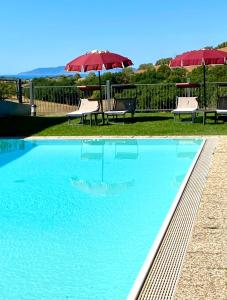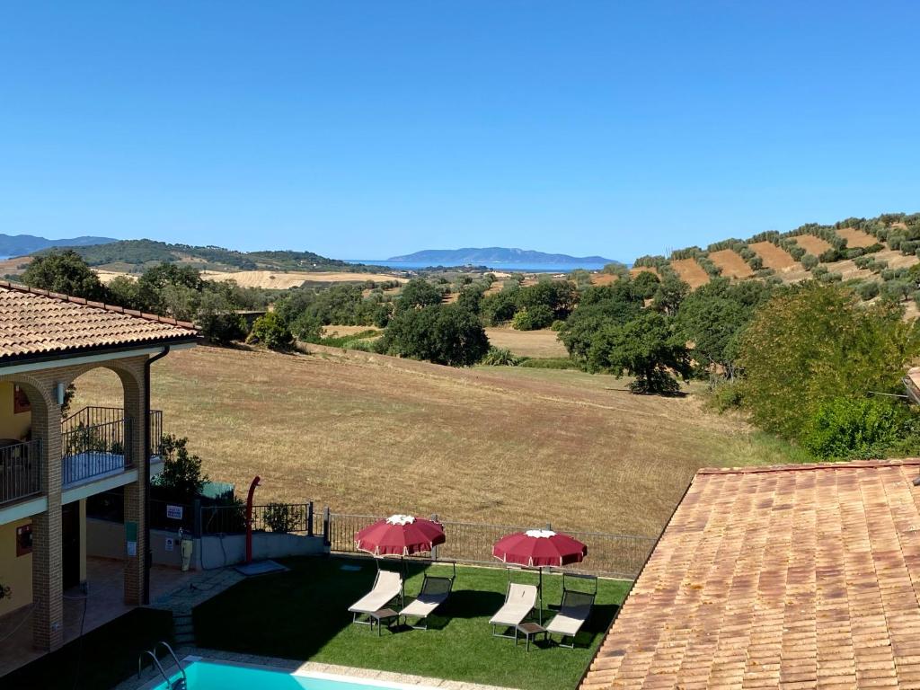 El estilo es simple pero elegante, con suelos de baldosas y muebles de madera clara. La piscina del Hotel Ristorante Le Querciolaie dei Ricci, rodeada por una zona de césped de estilo inglés, ofrece vistas al mar y la isla de Giglio.