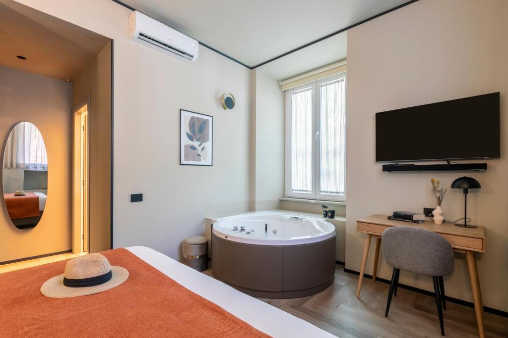 Guests will have a special experience as this double room provides a hot tub and a spa bath. Offering free toiletries, this double room includes a private bathroom with a shower, a bidet and a hairdryer. The air-conditioned double room offers a flat-screen TV with streaming services, soundproof walls, a tea and coffee maker, a wardrobe as well as a quiet street view. The unit offers 1 bed.