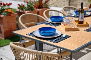 La villa tiene 6 dormitorios, 7 baños, ropa de cama, toallas, TV de pantalla plana, zona de comedor, cocina totalmente equipada y terraza con vistas al mar. El desayuno ofrece opciones a la carta, continentales o italianas.
