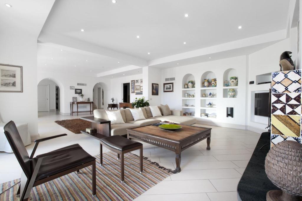 La villa dispone de 5 dormitorios, 6 baños, ropa de cama, toallas, TV con canales por cable, cocina totalmente equipada y terraza con vistas al mar. Marina di Puolo está a 11 km del alojamiento, y Roman Archeological Museum MAR está a 15 km.