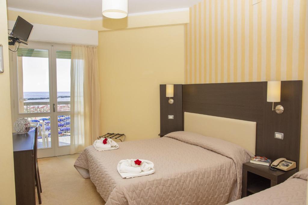 Cette chambre familiale dispose de la climatisation, d'une armoire et d'un balconet offrant une vue sur la mer. La salle de bains privative est pourvue d’une douche. Ce logement comporte 2 lits.