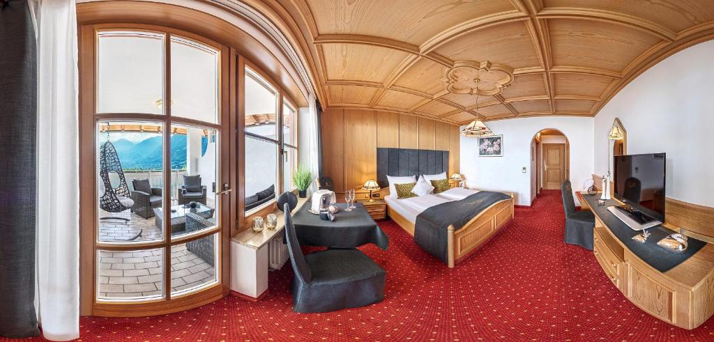 Large junior suite with south-facing balcony, with views of the valley, or the mountains, or Meran. Features carpeted floors and spruce-wood furniture.