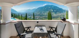 This double room features a balcony, minibar and views of Meran and the surrounding vineyards.