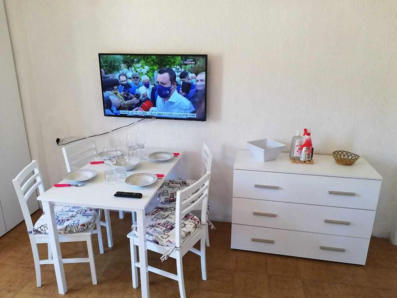 Cet appartement avec climatisation compte un coin repas, une cuisine avec un réfrigérateur et une télévision à écran plat.