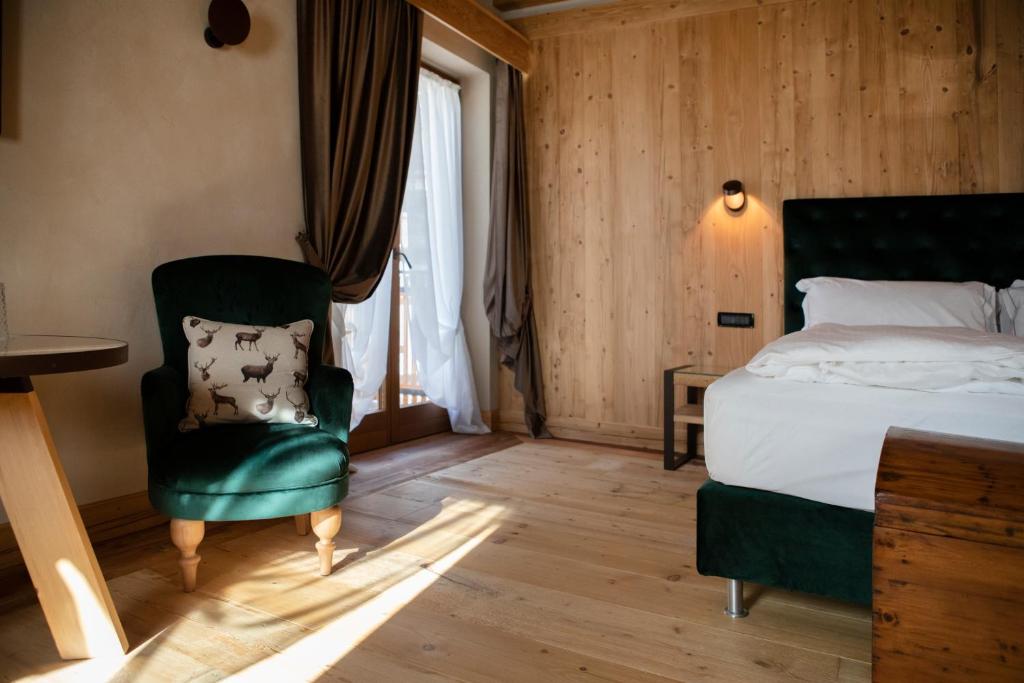 Spaziosa camera deluxe con vista sulle montagne, piccola terrazza e letto king-size.