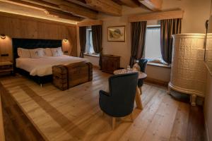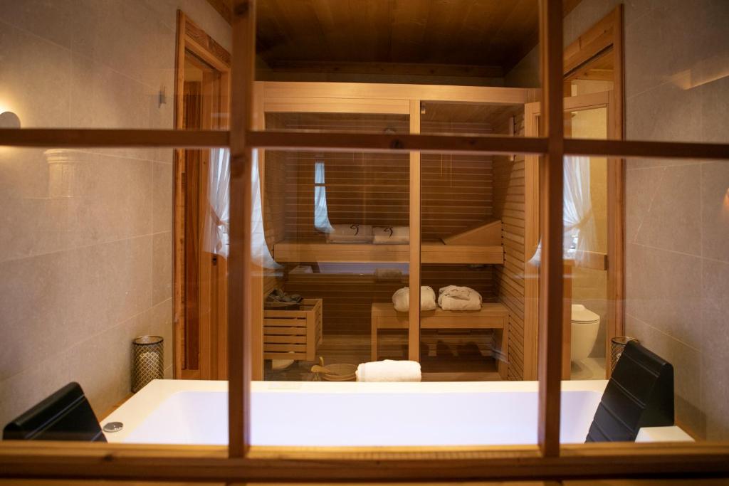 Spaziosa suite spa con antica stufa in maiolica, vasca idromassaggio e sauna finlandese.
