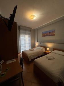 Camera doppia con letti singoli climatizzata dotata di armadio, balcone con vista sulla città e bagno privato con doccia. Presenta 2 letti.