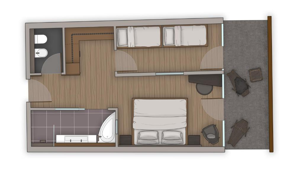 Camera familiare spaziosa e dotata di pareti insonorizzate, minibar, terrazza con vista si monti e bagno privato con vasca. L'alloggio presenta 5 letti.