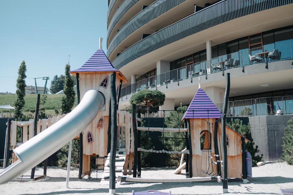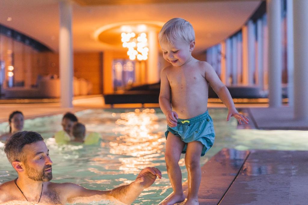 L'hotel prevede una piscina coperta, una sauna, un programma di intrattenimento serale e un mini club. Presso questo hotel, le camere comprendono una scrivania, una TV a schermo piatto, un bagno privato, le lenzuola, gli asciugamani e una terrazza con vista monti.