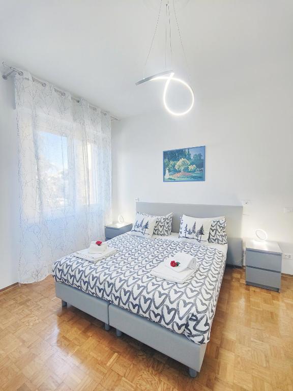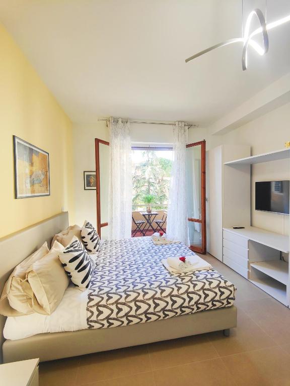 Camera matrimoniale climatizzata dotata di TV via cavo a schermo piatto, bagno privato e terrazza con vista sul giardino.