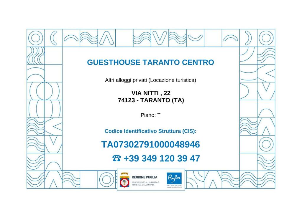 È possibile verificare la regolarità del CIN della struttura sul sito del Ministero del Turismo: Ricerca CINLocalità vicino a Guesthouse Taranto Centro, Taranto