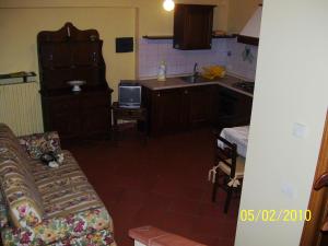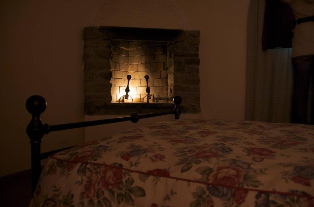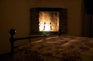 Questo appartamento dispone di una zona giorno con divano e di una camera matrimoniale con un camino antico.