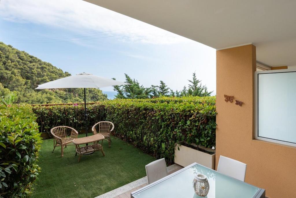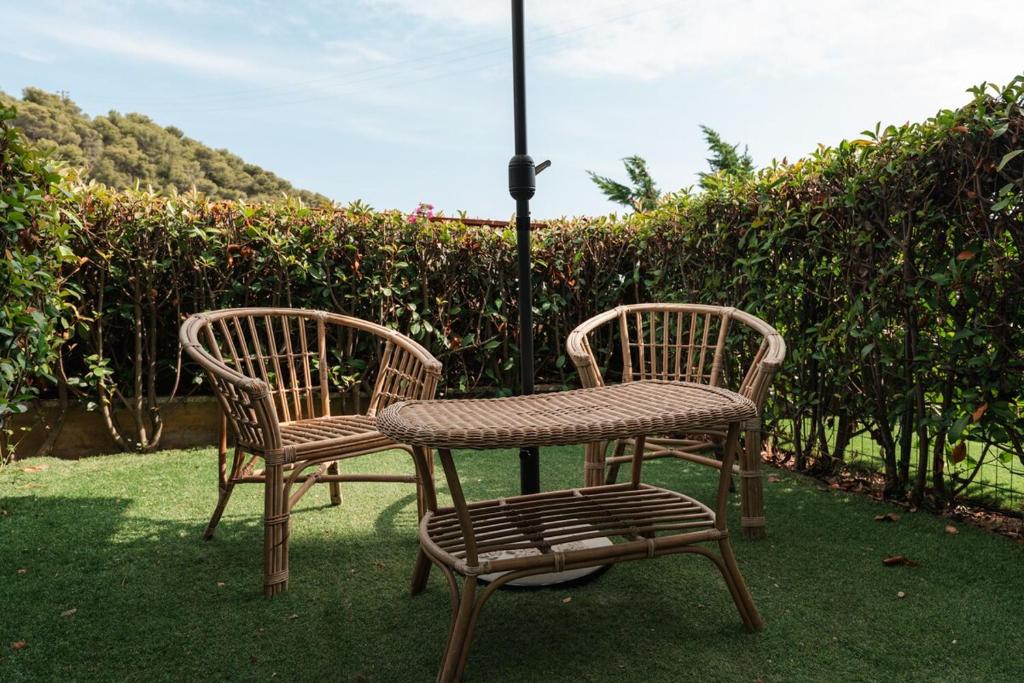Questo appartamento offre piscina privata, giardino e parcheggio privato gratuito. Questo appartamento con aria condizionata comprende 1 camera da letto, un soggiorno, una cucina con utensili e 1 bagno.