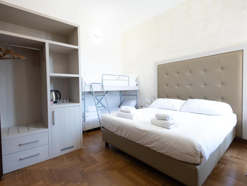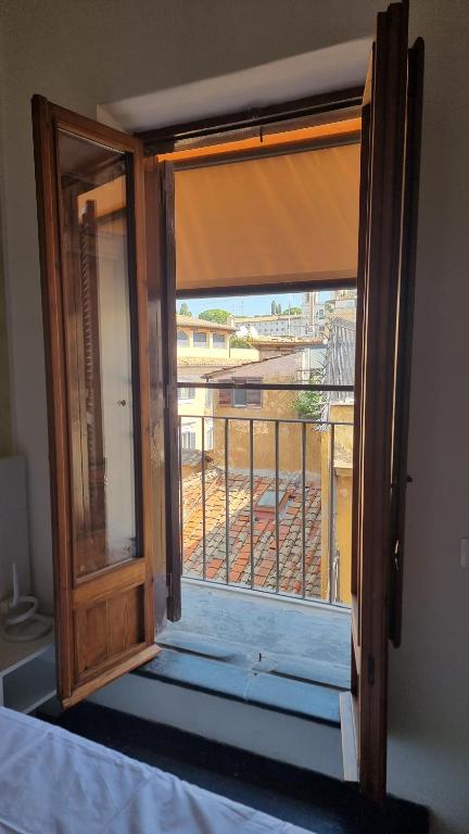 Camera quadrupla climatizzata e insonorizzata con balcone affacciato sulla città e bagno privato con doccia.
