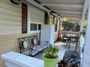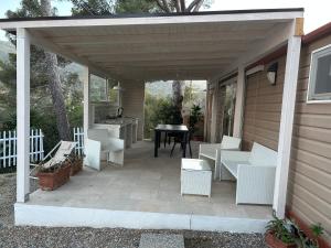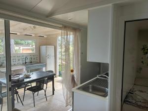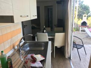 Sistemazione con angolo cottura e giardino arredato con tavoli e sedie.