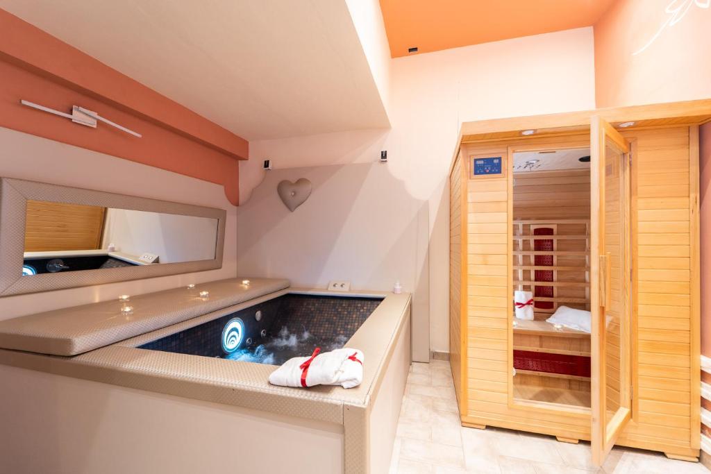 Suite dotata di sauna e vasca idromassaggio. Questa suite climatizzata propone un ingresso indipendente, 1 soggiorno, 1 camera da letto separata e 1 bagno con doccia e bidet. La suite si affaccia sul giardino e presenta pareti insonorizzate, una TV a schermo piatto con servizi di streaming e vino/champagne per gli ospiti. L’alloggio presenta 2 letti.