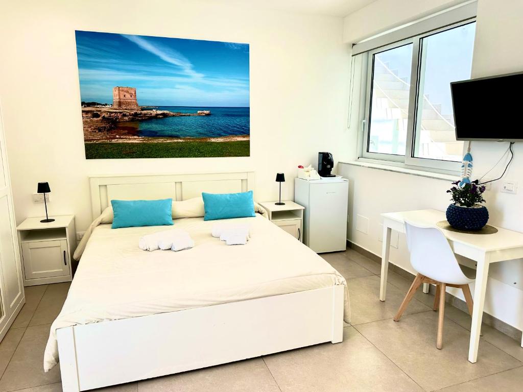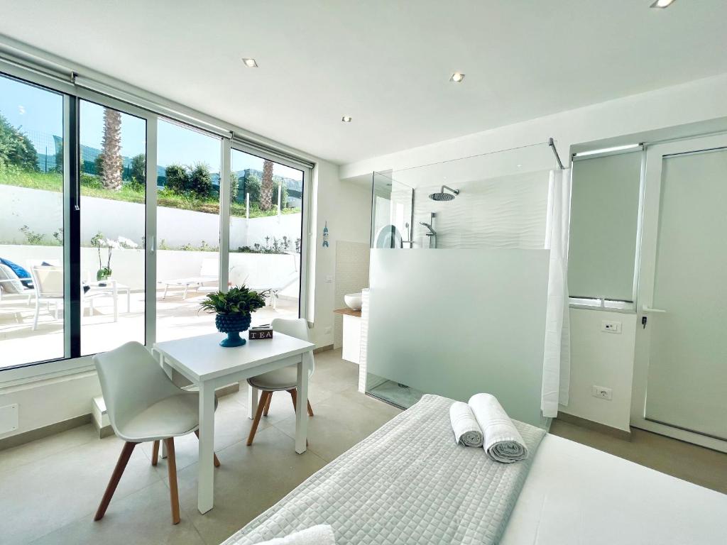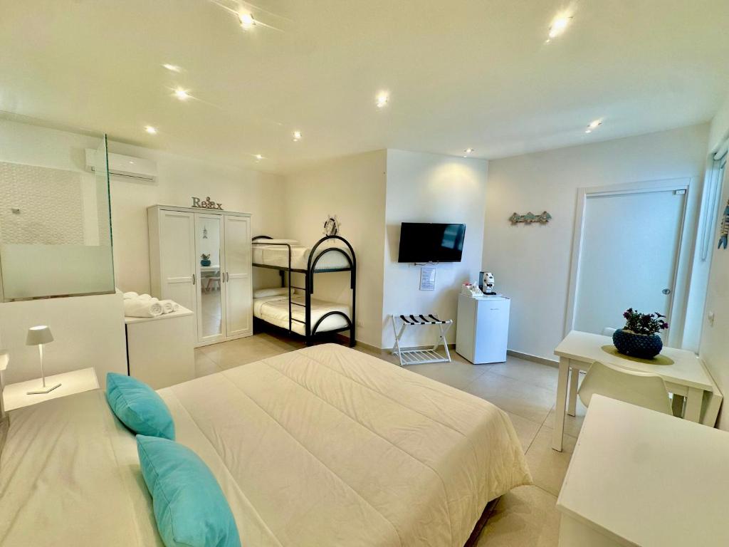 Questa spaziosa camera quadrupla è dotata di aria condizionata, pareti insonorizzate, terrazza affacciata sul mare e bagno privato con doccia. Presenta 3 letti.